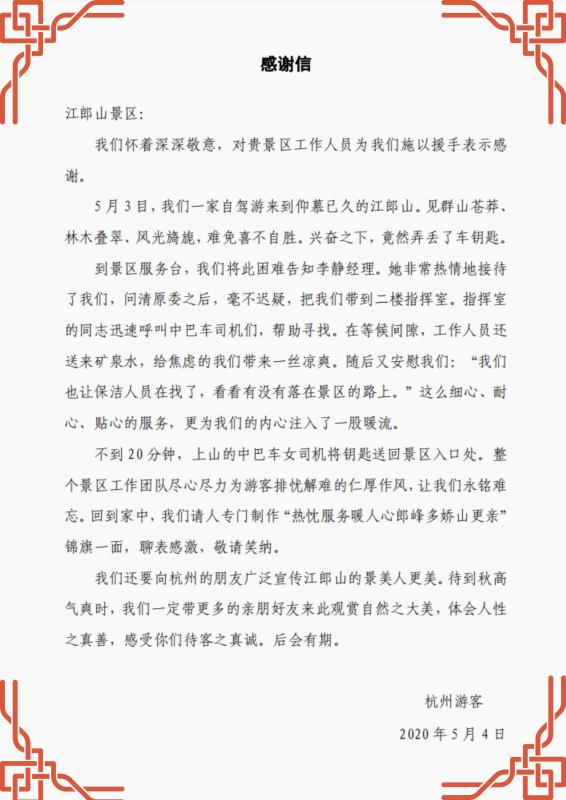 2月9日,旅发单位直属的江郎江南美风景区做到出自厦门游玩者发给的锦旗标语和感谢的话信,对江郎江南美风景区在职员工帮其获取丢掉的车钥匙展示出的公司执行工作上速率和损失感接受相对高度那肯定,对风景区每位工作上员工细致、耐烦、体贴的产品衷心祝愿恳切的道谢。
