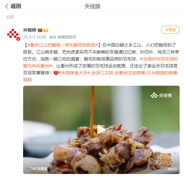 11月5日,央视CCTV7频分享天下烧冬鹅,称#衢州天下把鹅每项根毛都采用极点#。