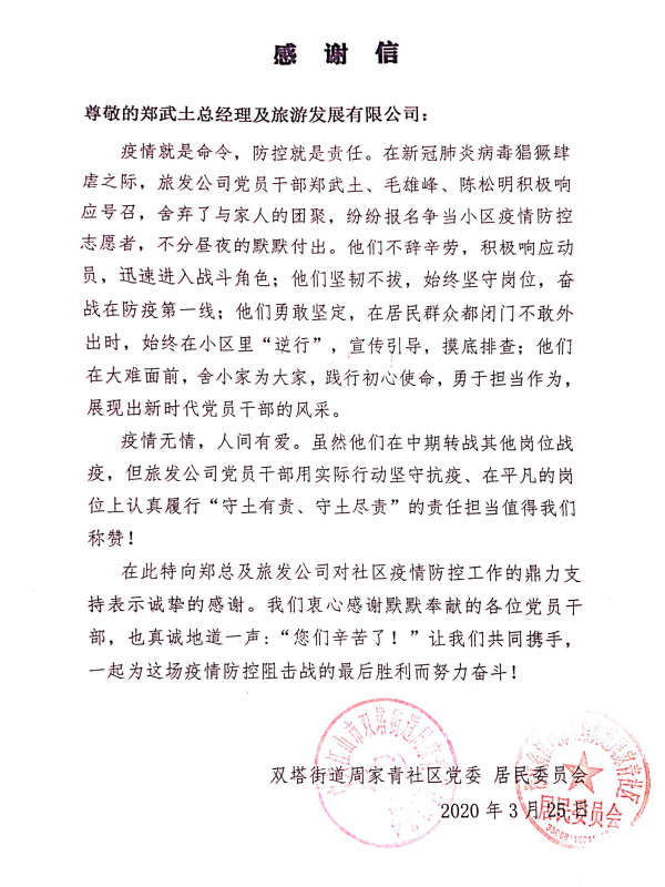 25日,工厂接受周家青社区服务中心居委会表示感谢信。