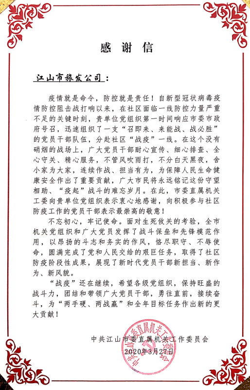27日,品牌接收到中国国民党万里江山市委各直属机关事业单位事情理事会会感恩信。